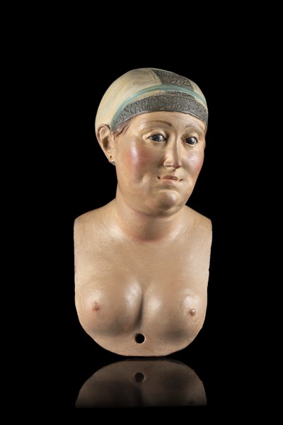 Ignoto, secolo XVIII "Testa di foritana" in terracotta policroma con occhi in cristallo, capigliatura chiusa in una particolare cuffia detta "procidana" segno della provenienza dall'Isola di Procida (h. cm 14,5) (difetti)
