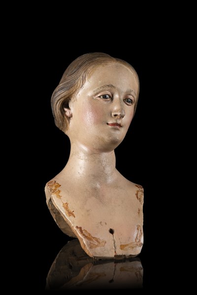 Unknown artist, first half of the 19th century "Madonna head" A polychrome wooden head with crystal eyes (h. cm 14) (defects)