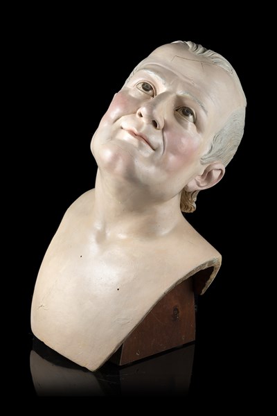 Arte napoletana, fine secolo XIX "Testa di vecchio" in legno policromo con occhi in cristallo a grandezza umana, per l'adesione ai suoi caratteri si attribuisce allo scultore Francesco Citarelli (1790-1871) Su base in legno (h. cm 38) (danni e restauri)