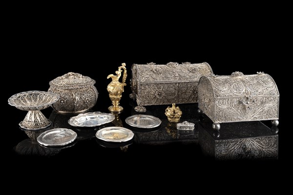 Arte napoletana, secolo XVIII/XIX, gruppo di accessori da presepe composto da: acquamanile in bronzo dorato, nel Medioevo avente funzione di contenitore di acqua profumata; tre piatti polilobati, di cui uno cifrato L.F. per cui si propone l'attribuzione all' argentiere Luigi Frezza attivo alla fine del '700/ inizio '800; vassoio in argento; un'alzata e tre scrigni di cui uno di forma globulare in filigrana d'argento, contenitori dei preziosi che i Re Magi offrivano a Gesù Bambino; e una corona in bronzo dorato. Per le filigrane e la brocca è accertata la provenienza dalla raccolta presepiale Ricciardi, tramite gli ultimi eredi (difetti)