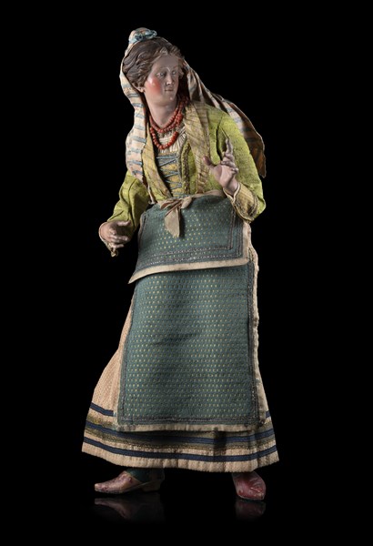 Arte napoletana, secolo XVIII/XIX "Foritana" figura da presepe in terracotta policroma. Occhi in cristallo, mani e piedi in legno, bustino giallo, gonna e grembiule con fili dorati, collana in corallo. Attribuibile all'artista Angelo Viva (Napoli 1758-1824) allievo del famoso scultore Giuseppe Sanmartino (h. cm 42) (difetti)