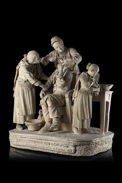Workshop of Vaccaro Bongiovanni, Caltagirone, 19th century. "Tooth-puller" A polychrome terracotta group. Inscribed on the base.