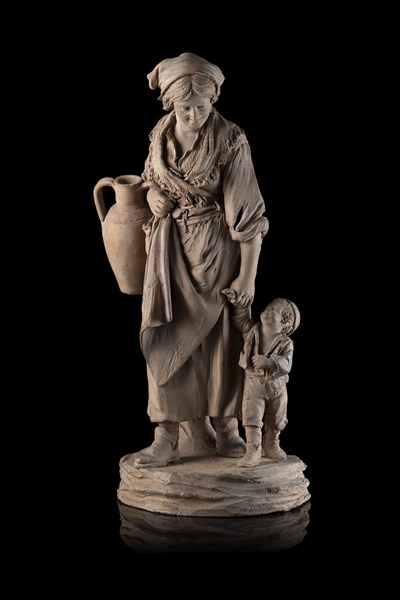 Giacomo Vaccaro (Caltagirone 1847-1931), "Contadina con bambino e brocca" gruppo in terracotta monocroma. Firma incussa alla base "G. Vaccaro Caltag". La composizione richiama la schematizzazione presepiale impiegata nella costruzione del grande presepe di Modica con il padre, Giuseppe (Caltagirone 1808-1889), e Giacomo Azzolina (Caltagirone 1854-1926) (h. cm 32) (difetti e piccolo restauro)
