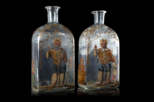 Manifattura veneta, seconda metà secolo XVIII, due "Bottiglie per la Manna di San Nicola di Bari" in vetro bianco dipinto a forma di parallelepipedo, centrate dalla figura del Santo e decorate ai lati rispettivamente con due contadini pellegrini e scena di miracolo tratta dalla Legenda Aurea (h. cm 35 e cm 34) (usure)