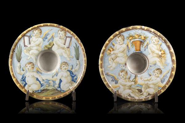 Manifattura di Castelli, Bottega dei Grue, secolo XVIII, due piattini (trembleuse) in maiolica policroma decorata con putti nella tesa. Numerati al retro (d. cm 18) (sbeccature)