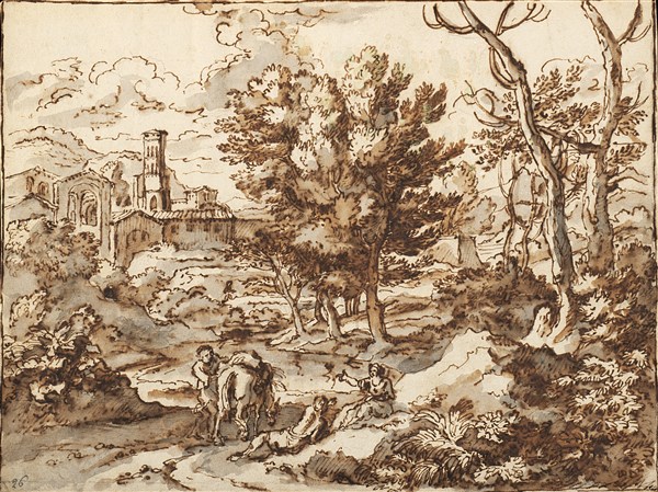 Carlo Antonio Tavella (attr.) Paesaggio con viandanti in riposo Penna e inchios