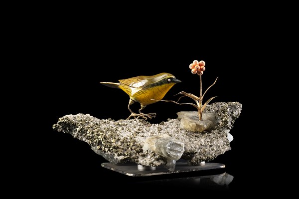 Romolo Grassi. Gruppo in quarzo e pirite sormontato da volatile in smalti con zampe in oro 18K e occhi in diamanti, fiore in smalti con bacche in corallo rifinite con diamanti, foglie in oro e smalti (cm 26x12x19) Firmato sotto la base "Romolo Grassi orafo Milano" (difetti)