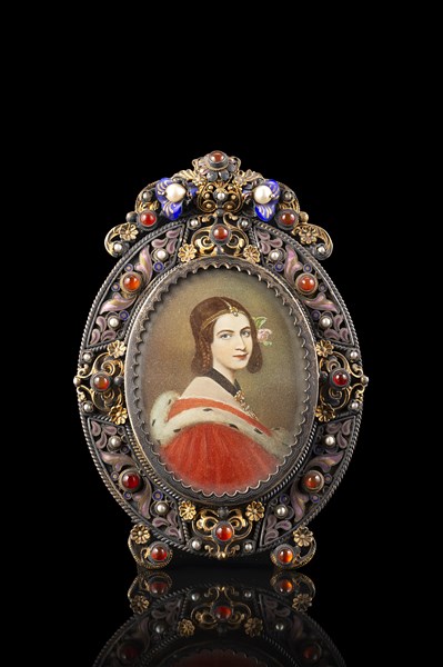 Lot 217 | Cornice a cavalletto in argento e vermeille decorata a volute smaltate in polic