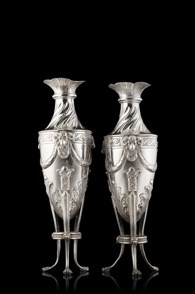 Coppia di vasi ad anfora in argento sbalzato su base tripode decorati a volute, festoni e teste di ariete. Punzoni non decifrati (h. cm 29) (g 760) (lievi difetti)