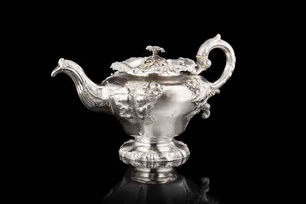 Teiera in argento con corpo globulare decorato a motivi floreali, ansa sagomata a tutto tondo a ricciolo, presa del coperchio a guisa di fiore. Londra 1804. Argentiere Robert Hennell I & Samuel Hennell (h. cm 17) (g 800) (lievi difetti)