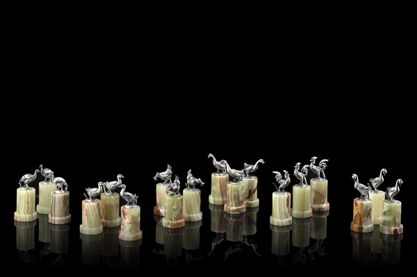 Gruppo di diciotto segnaposto con basi in onice sormontate da figure di volatili a tutto tondo in argento (h. cm 7) In custodia