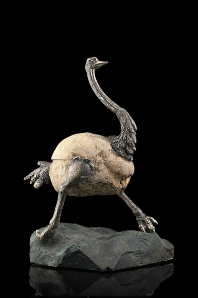 Struzzo con corpo in agata e base in marmo, gambe e collo in argento. Titolo 800 (h. cm 33)