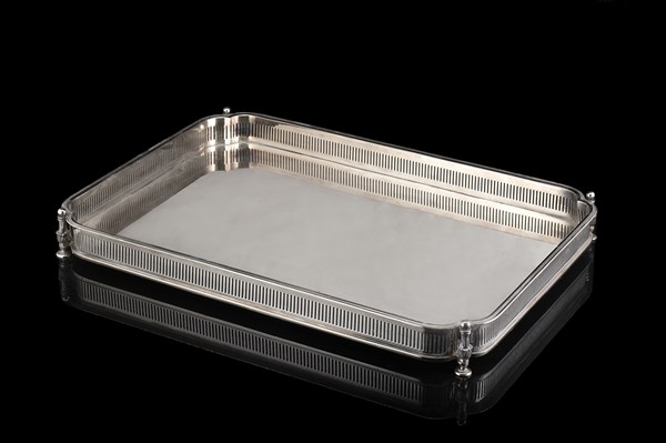 Vassoio in argento con bordo a ringhiera traforata e piedi a colonnine. Titolo