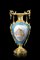 Manifattura francese, fine secolo XIX. Vaso in porcellana a fondo blu decorato in policromia ad amorini e paesaggio con volatili entro riserve a volute dorate. Anse e ghiere in bronzo (h. cm 35) (lievi difetti)