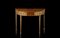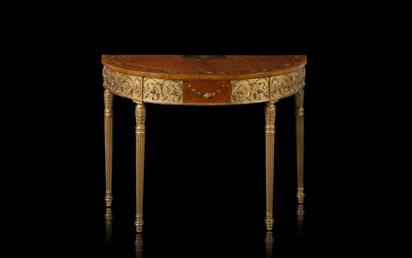 Tavolo da parete demilune in legno dorato, fascia intagliata a girali di foglie. Piano e cartella lastronati in radica, filettati e dipinti a fiori e a festone con medaglione. Gambe rastremate e scanalate intagliate all'attacco a foglie d'acanto (cm 112x85x47,5) (lievi difetti)