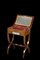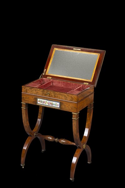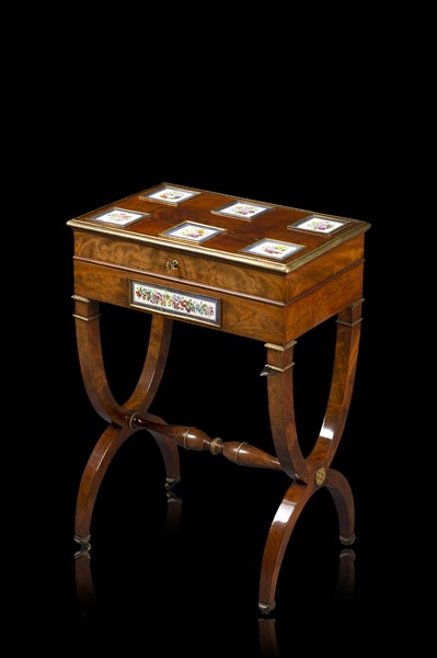 Tavolo da lavoro lastronato in mogano e decorato da placche in porcellana policroma. Anta reclinabile celante vani e candeliere. Profili e capitelli in bronzo dorato. Gambe mosse riunite da traversa tornita e munite di rotelle. Secolo XIX (cm 54x76x35) (difetti)