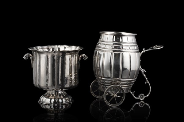 Lotto composto da un porta ghiaccio a forma di botte ed un vasetto biansato. Titoli 800 e 900 (cm 18,5x18x9,5; cm 16,5x13,3) (g 950 ca.)