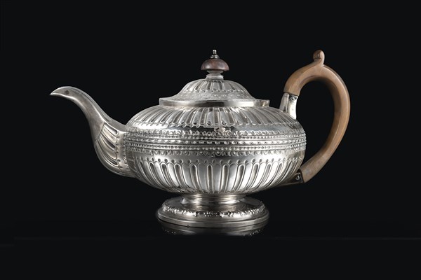 Teiera in argento di forma bombata decorata a motivi geometrici e vegetali stilizzati. Ansa e presa in legno tornito. Londra, 1831. Argentieri John & Herny & Charles Lias (h. cm 15) (g lordi 600)