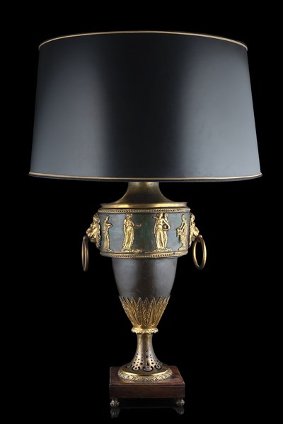 Lampada in forma di vaso in metallo dipinto decorato da fregi classici e teste