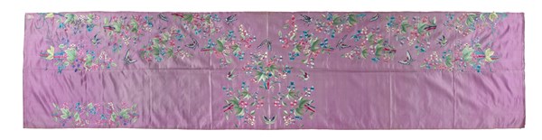 Ricamo in seta policroma su fondo in raso di seta lilla raffigurante rami fioriti con farfalle. Cina, fine secolo XIX (cm 295x76) (lievi difetti)