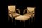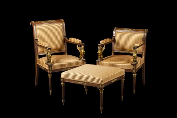 Lotto composto da due poltrone con schienale estroflesso terminante a ricciolo, braccioli sorretti da sfingi alate in bronzo a tutto tondo, gambe anteriori scanalate, posteriori a sciabola, applicazioni in bronzo. Unite a un panchetto di simil decoro (misure diverse) (lievi difetti)