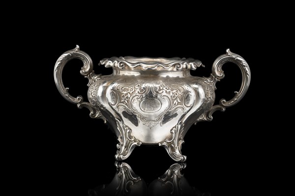 Zuccheriera biansata in argento con interno in vermeille, corpo di forma bombata decorato a ghirlande e tralci fioriti, piedini a ricciolo. Londra, 1861. Argentieri Edward, Edward Jr., John and W. Barnard (cm 22x11,5x14) (g 400)