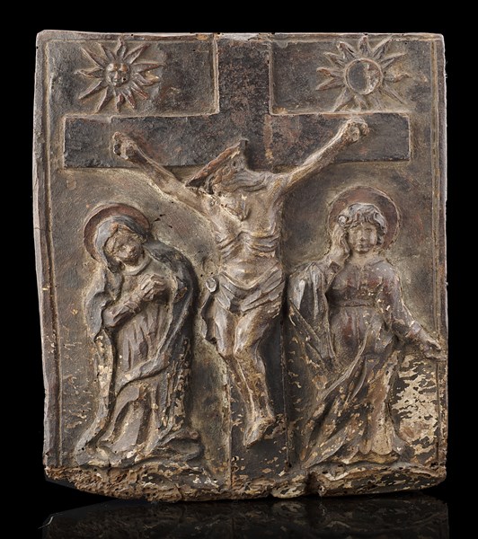 Arte del secolo XVI "Crocifissione" pannello ligneo decorato in policromia (cm 39x34,5) (difetti e mancanze)