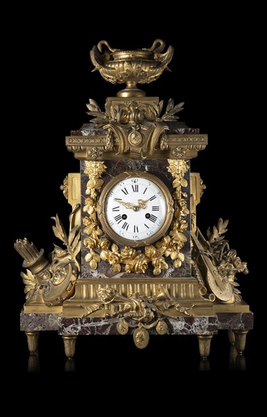 Ormolu and marble mantel clock modelled with allegorical figures.