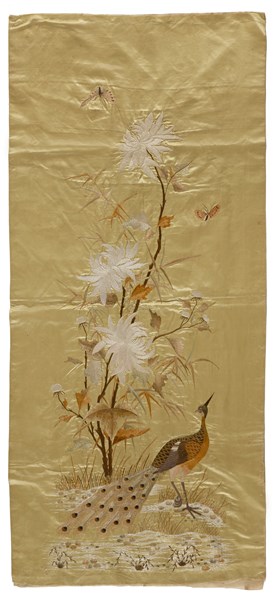 Ricamo in seta su raso di seta gialla raffigurante un pavone dinanzi ad un ramo di peonie rosa nei toni del tabacco, marrone, nocciola, beige, arancio e verde salvia. Cina, fine secolo XIX (cm 121x55) (difetti e macchie)