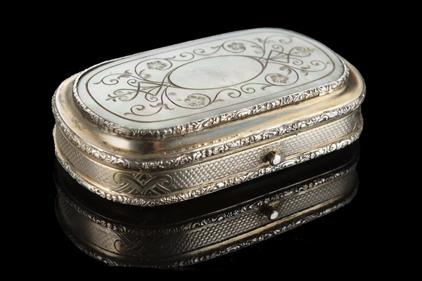 Scatola in argento inciso e zigrinato, coperchio in madreperla decorato a motiv
