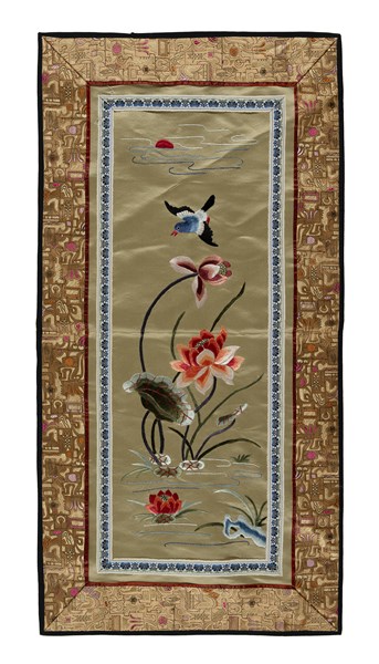 Ricamo in seta policroma su raso di seta color salvia raffigurante paesaggio con rocce e rami fioriti cosparso di animali e volatili. Cina, inizio secolo XX (cm 56x24)
