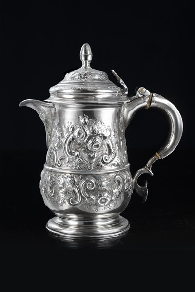 Versatoio in argento con corpo sbalzato a fiori e volute, presa tornita e ansa sagomata. Inghilterra, secolo XVIII/XIX (h. cm 23) (g lordi 920)