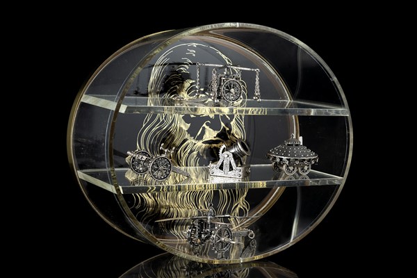Gruppo di cinque toys in argento raffiguranti macchine belliche progettate da Leonardo da Vinci. Contenuti in teca. Titolo 925. Edizione Italcambio 35/850 (g 550)