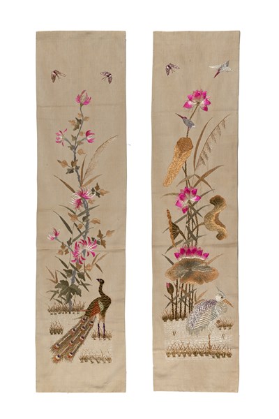 Coppia di ricami in seta policroma su tessuto di seta color beige raffigurante volatili a terra di fianco a rami di fiori di loto. Cina, fine secolo XIX (122x30;120x28) (lievi difetti)
