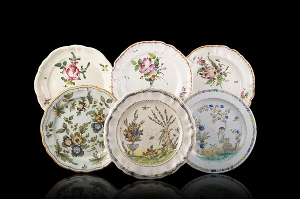 Lotto composto da tre piatti della manifattura di Lodi del secolo XVIII e tre di manifatture diverse in maiolica decorata in policromia a fiori e paesaggi (misure differenti) (difetti e restauri)