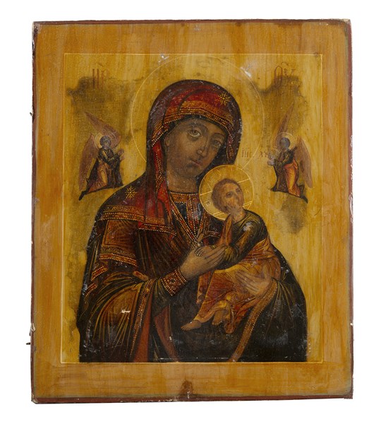 A19th-century Russian art "Madonna with child" oil on panel icon with silver and vermeille riza. Silversmith Kozlov (cm 34x27) (minor defects)