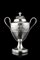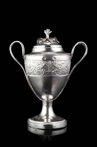 Zuccheriera biansata in argento con fascia cesellata e sbalzata a motivi vegetali, presa del coperchio a foglie e fiore a tutto tondo. Belgio? Secolo XIX. Cifrata alla base (h. cm 20) (g 320)