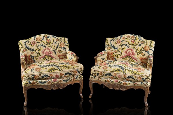 Coppia di bergère in rovere, braccioli e gambe intagliati e sagomati, rivestite in tessuto a piccolo punto. Francia, secolo XVIII (difetti)