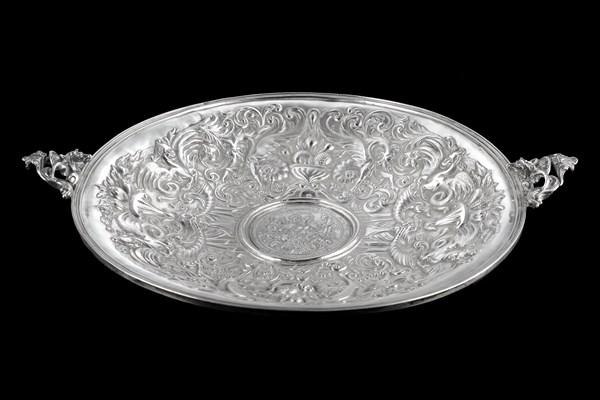 Alzata in argento con corpo sbalzato a mascheroni, animali fantastici ed elementi vegetali, decorato al centro da medaglia datata 1634 e inscritta "Dux glorios princ pius heros invict victor incomparab triumph felix & germ liberator". Anse a volute e teste di cavallo, piedi a valve di conchiglie sorrette da cherubini. Secolo XIX (l. cm 40) (g 990)