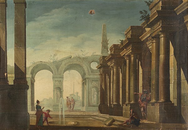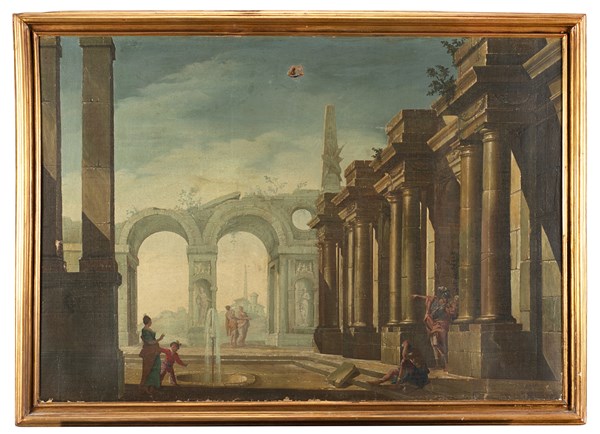 Scuola lombarda del secolo XVIII Capriccio con architetture e figure Olio su t