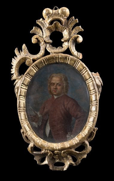 Scuola del secolo XVIII "Ritratto di gentiluomo" miniatura ovale su rame (cm 10x8) In cornice intagliata e dorata (restauri e mancanze)