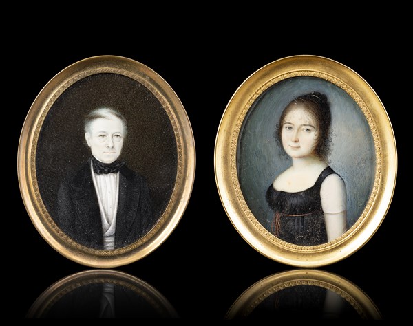 Raffaello Desio (Secolo XIX) "Ritratto di gentiluomo" miniatura ovale (cm 7x5,5) unita ad una di autore diverso raffigurante gentildonna (cm 6,5x5,5) In cornici (lievi difetti)