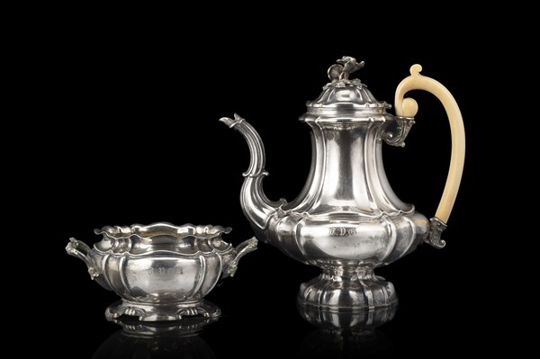Lotto composto da teiera e zuccheriera biansata in argento a corpo costolato. Ansa in avorio e presa del coperchio a guisa di fiori a tutto tondo, basi sagomate. Cifrate TPG. Milano, Pietro Bottacchi dal 1834 al 1855 ca. (g 1300)