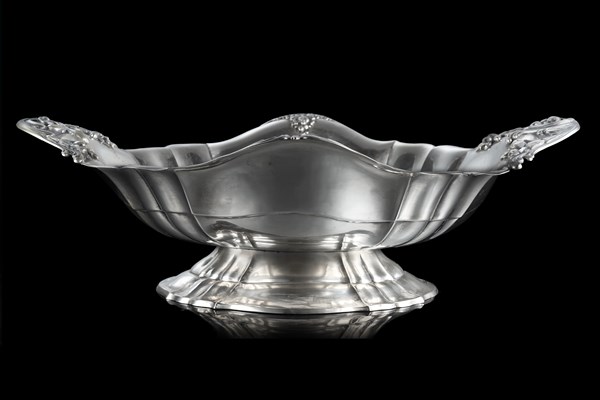 Centrotavola in argento biansato con bordo mistilineo decorato a frutti. Titolo