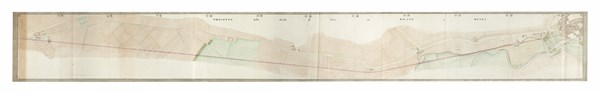 [SURVEY MAP - MILAN]. Handwritten and watercolor cadastral map, folded several times, on large-format paper of the "Progetto della Strada di ferro da Milano a Monza", the raylroad project from Milan to Monza (6620x 822mm approx.). Edited by the engineer Giulio Sarti (1792 - 1866) and dated Milan, December 31, 1837. Excellent state of conservation (except for a lateral tear and some minor tears). With several "bolli straordinari" at the top
