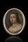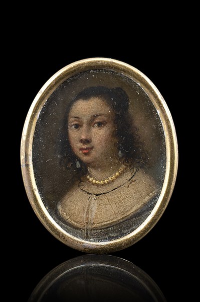 17th-century school "Portrait of a gentlewoman with pearls" miniature on copper (cm 5x4) In frame (defetcs)