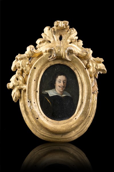Scuola del secolo XVII "Ritratto di gentiluomo" miniatura ovale su rame (cm 8,5x6,5) In cornice in legno intagliato e dorato (restauri e mancanze)