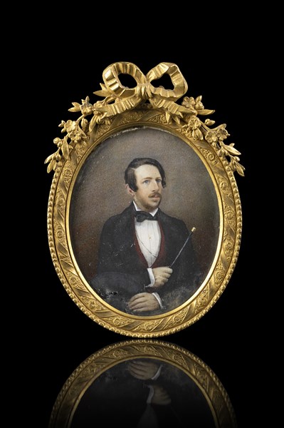 Maestro del secolo XIX "Ritratto di gentiluomo" miniatura ovale su avorio (cm 8x6) In cornice in bronzo con fiocco (difetti)