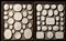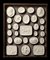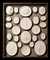Collezione di cinquanta cammei in gesso raffiguranti soggetti classici e profili, uno firmato S. Passamonti. In teche (cm 28x23) (difetti)
