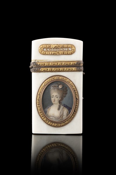 Carnet da ballo in avorio con cornici e profili in oro inscritti "Souvenir d'amitié". Miniatura ovale raffigurante gentildonna. Francia, secolo XVIII (cm 9x5) (mancanze)